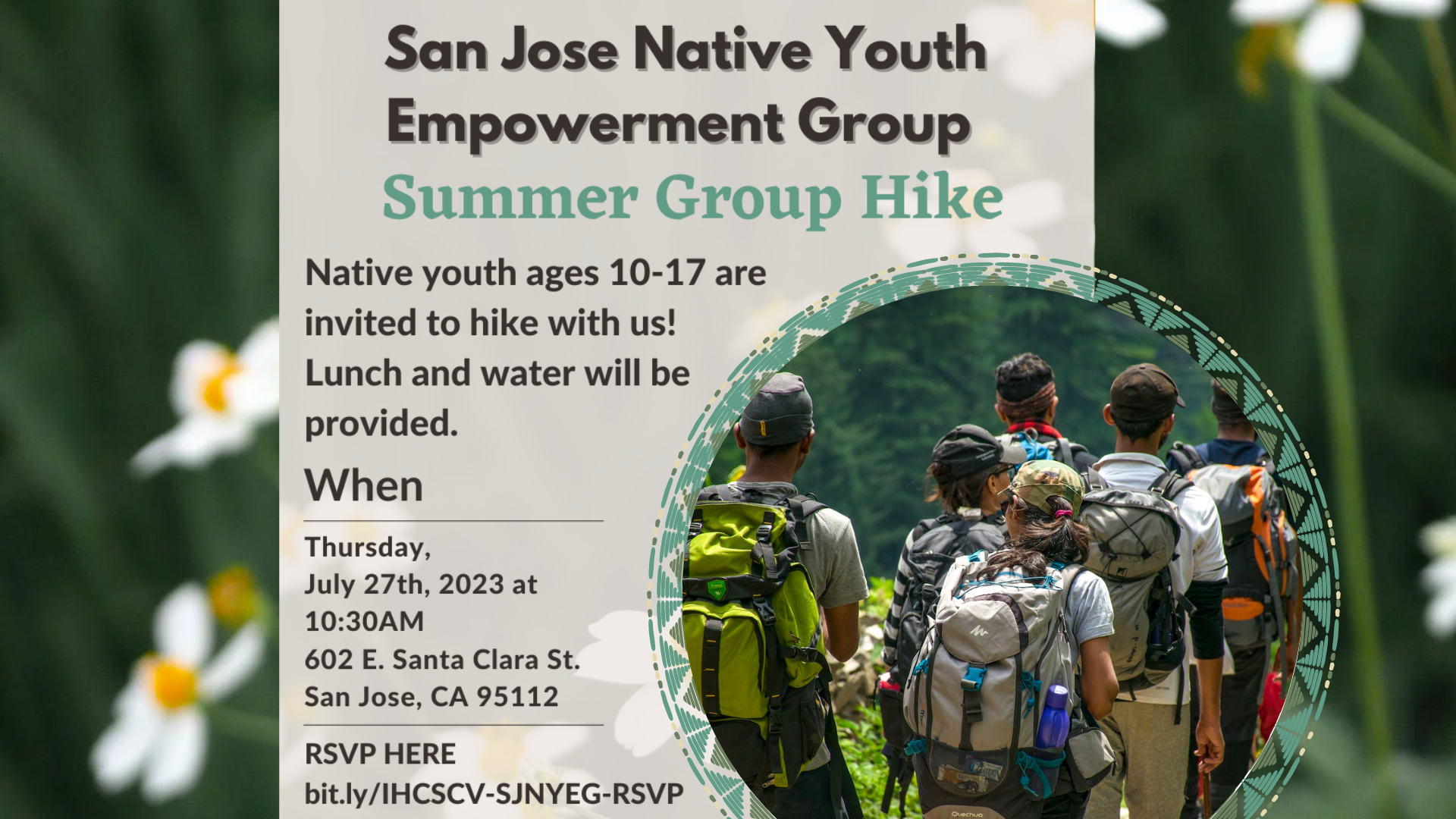 Native youth ages 10-17 are invited to attend a hike on Thursday, July 27th, 2023 at 10:30 AM, for this month’s San Jose Native Youth Empowerment Group!