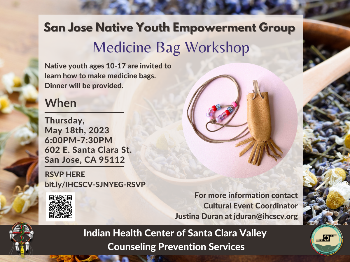 Our Counseling Prevention Services will host a Medicine Bag Workshop. Dinner and beverages will be provided. The workshop will be on Thursday, May 18th, 2023 from 6:00 pm to 7:30 pm at 602 E. Santa Clara St., San Jose, CA 92112.